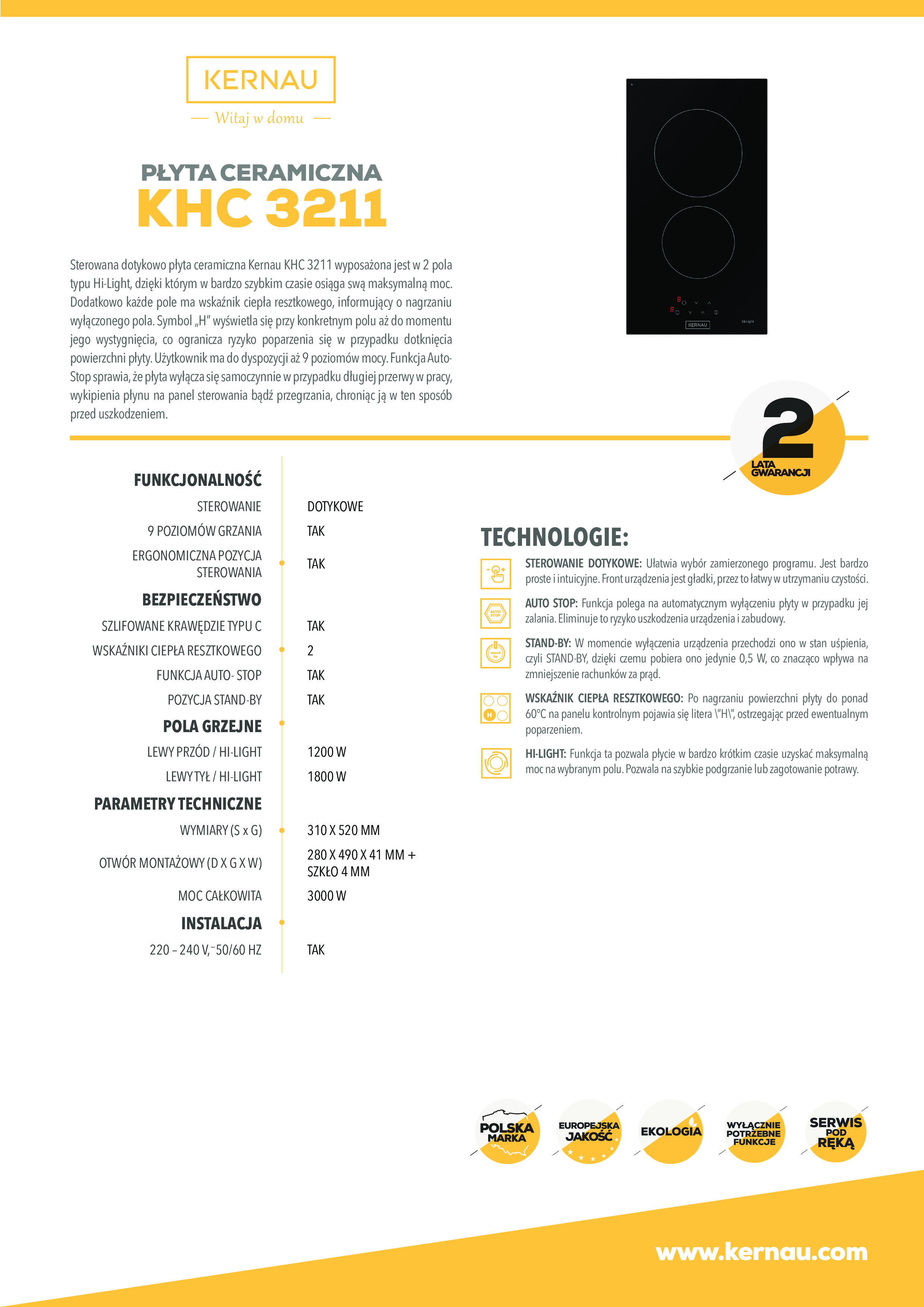 Płyta ceramiczna o szerokości 31cm. 2 pola grzewcze typu Hi-Light. Sterowanie sensorowe (dotykowe). 9 poziomów mocy. Zabezpieczenie przed przegrzaniem AUTO-STOP. Wskaźnik zalegania ciepła resztkowego dla każdego pola. Wykończenie: Bezramkowa z szlifowanymi krawędziami. Linia estetyczna: Nowoczesna.