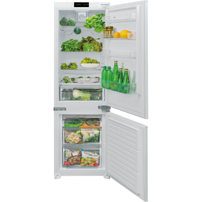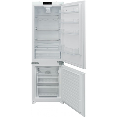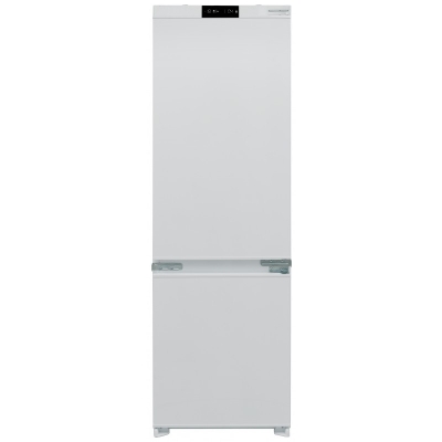 Chłodziarko-zamrażarka do zabudowy, typu Kombi, z zamrażarką w dolnej częśći i chłodziarką w górnej części, o wysokości 177cm. Komora chłodziarki, chłodzenie statyczne, komora zamrażarki chłodzenie NO-FROST. Sterowanie elektroniczne z wyświetlaczem LED. Pojemność całkowita netto: 243l. Klasa klimatyczna T/N. Liczba kompresorów: 1. Czynnik chłodniczy: R600A. Zdolność zamrażania: 3kg/24h. Głośność 41 dB(A). Roczny pobór energii: 218 kWH. Klasa energetyczna E. Linia estetyczna: Nowoczesna.
