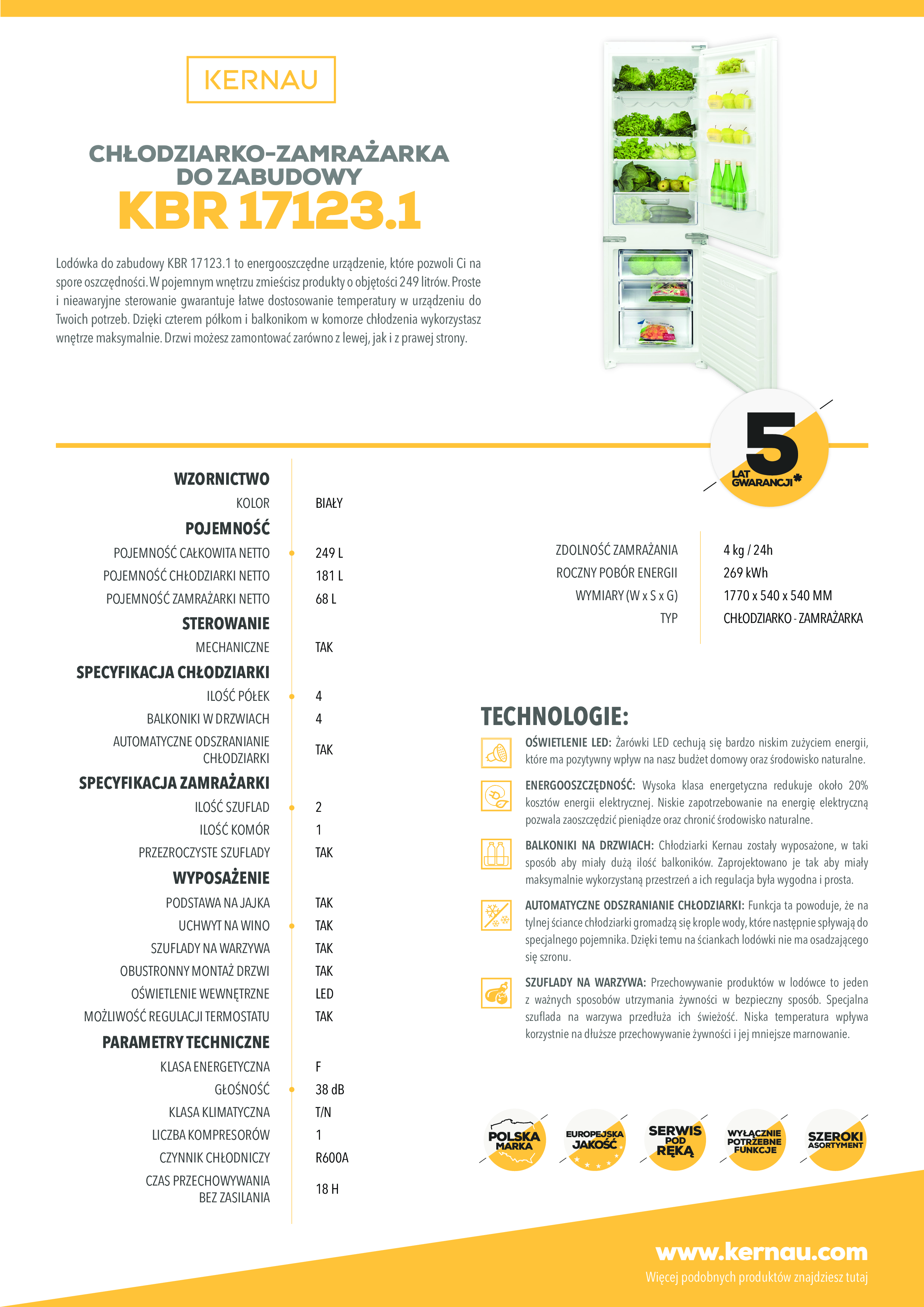 Chłodziarko-zamrażarka do zabudowy, typu Kombi, z zamrażarką w dolnej częśći i chłodziarką w górnej części, o wysokości 177cm. Komora chłodziarki i zamrażarki, chłodzenie statyczne. Ilość półek w chłodziarce: 4. Ilość szuflad w zamrażarce: 2 oraz 1 półka. Sterowanie mechaniczne. Pojemność całkowita netto: 249l. Klasa klimatyczna T/N. Liczba kompresorów: 1. Czynnik chłodniczy: R600A. Zdolność zamrażania: 4kg/24h. Czas przechowywania bez zasilania: 18h. Głośność 38 dB(A). Roczny pobór energii: 269kWh. Klasa energetyczna F. Linia estetyczna: Nowoczesna.
