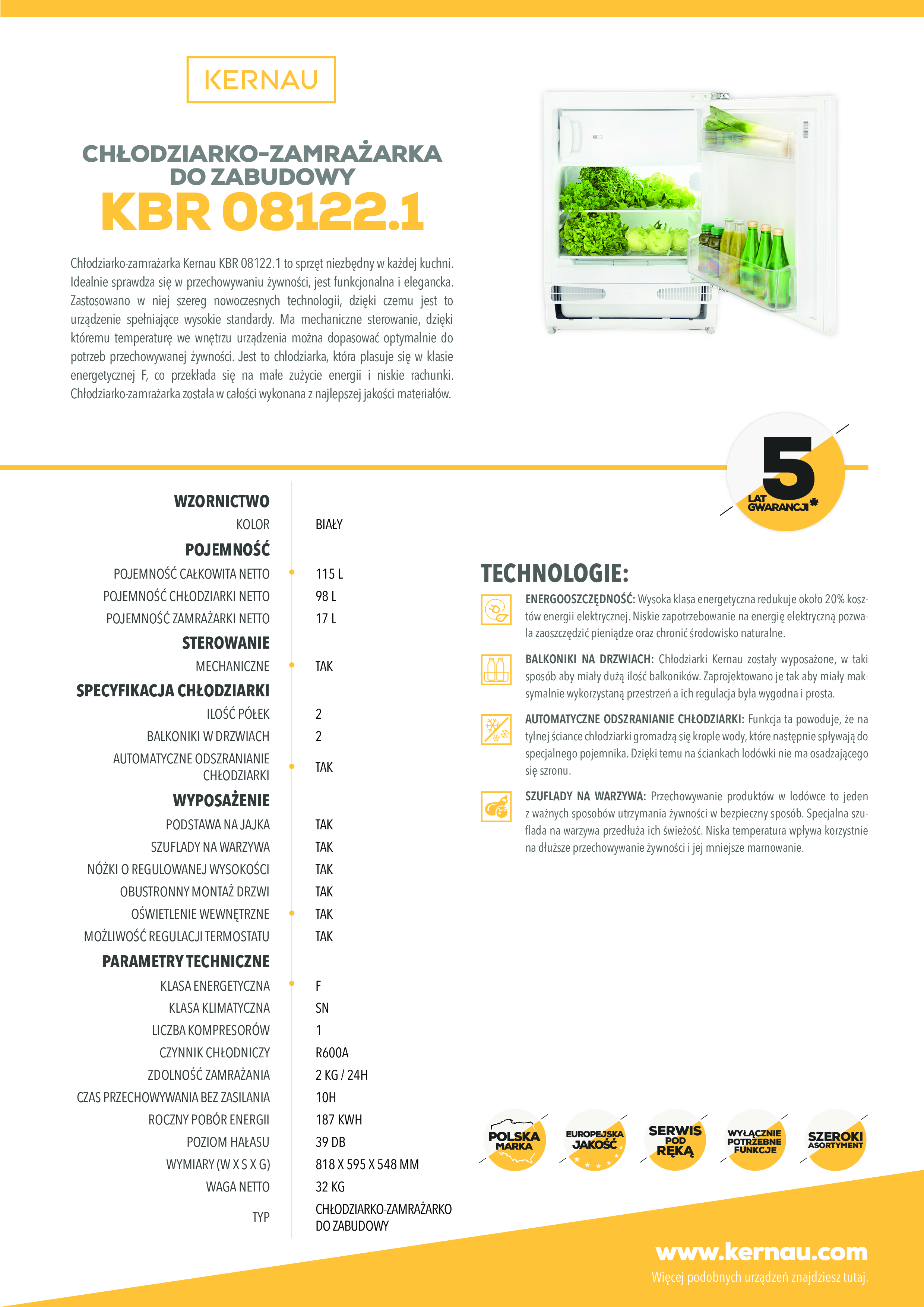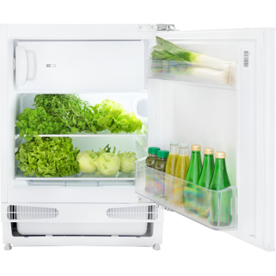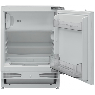 Chłodziarko-zamrażarka podblatowa do zabudowy. Chłodzenie statyczne. Ilość półek: 2 i dwa balkoniki w drzwiach. Sterowanie mechaniczne. Automatyczne odszranianie chłodziarki. Pojemność całkowita netto: 115l. Klasa klimatyczna SN. Liczba kompresorów: 1. Czynnik chłodniczy: R600A. Zdolność zamrażania: 2kg/24h. Czas przechowywania bez zasilania: 10h. Głośność 39 dB(A). Roczny pobór energii: 187kWh. Klasa energetyczna F. Linia estetyczna: Nowoczesna.
