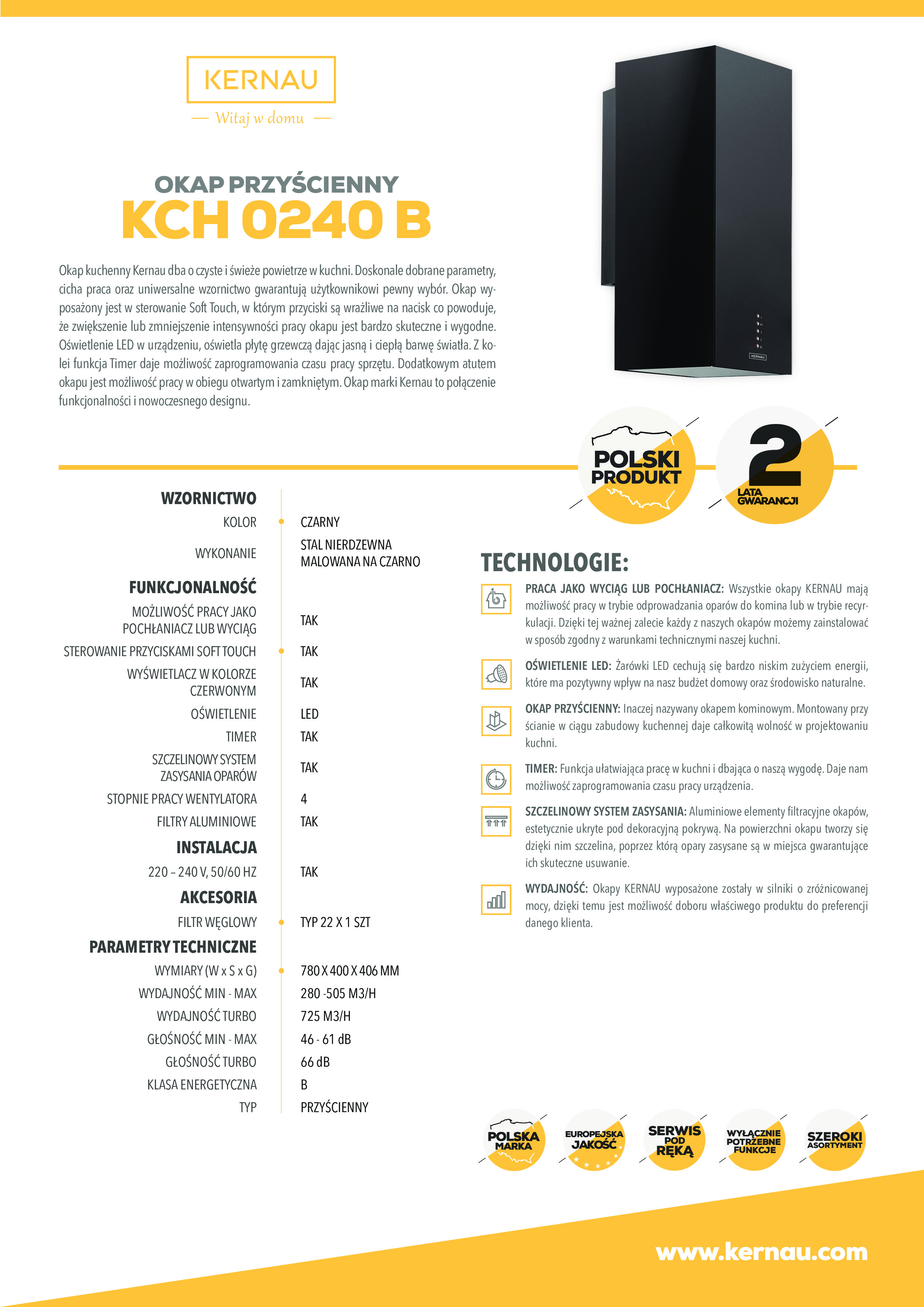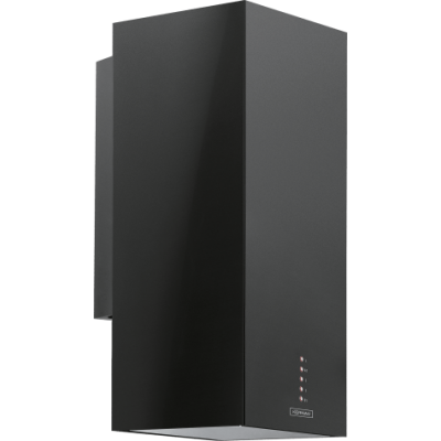 Okap przyścienny, kominowy o szerokości 40cm. 4 poziomy regulacji mocy w tym funkcja Turbo. Sterowanie elektroniczne, przyciski typu Soft Touch. Timer. Wyświetlacz. Kolor wyświetlacza: czerwony. Dwa punkty oświetleniowe LED, o mocy 3W każdy. Zasysanie oparów szczelinowe. Filtr aluminiowy, kasetonowy, przeciwtłuszczowy, przystosowany do mycia w zmywarce. Maksymalna wydajność 731m3/h. Głośność maksymalna 67 dB[A]. Wykończenie w kolorze Czarnym.