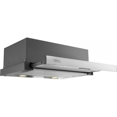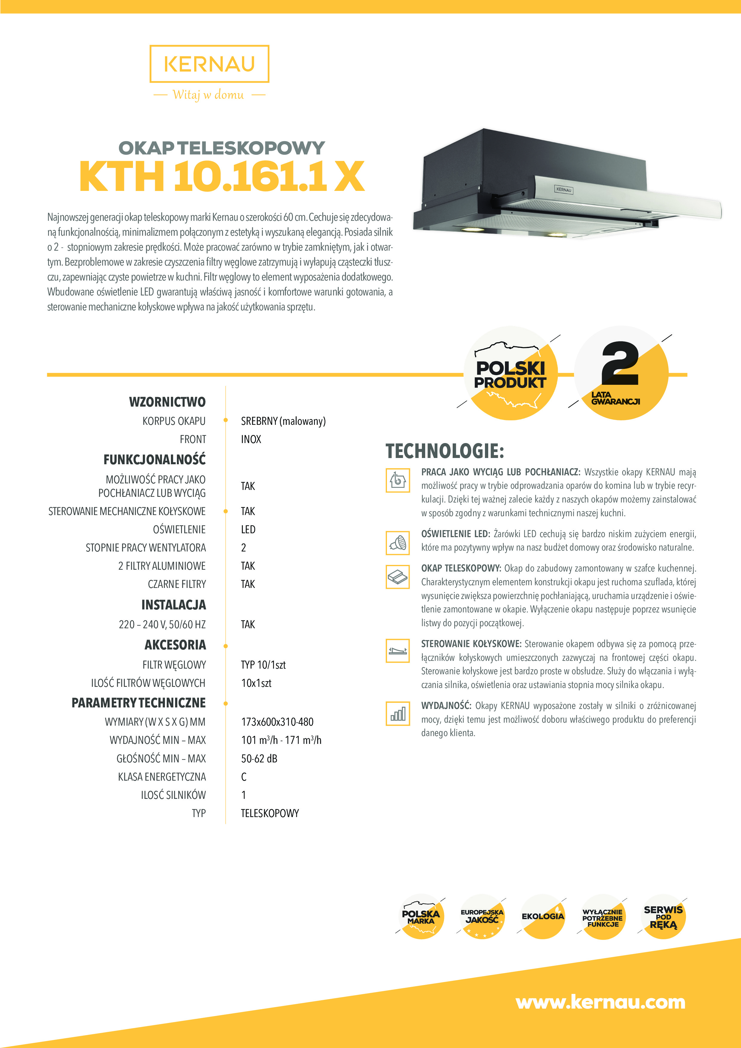 Okap teleskopowy, do zabudowy o szerokości 60cm. 2 poziomy regulacji mocy. Malowany front. Sterowanie mechaniczne, kołyskowe. Dwa punkty oświetleniowe LED. Podwójny filtr aluminiowy, kasetonowy, przeciwtłuszczowy, przystosowany do mycia w zmywarce. Możliwość pracy jako pochłaniacz lub wyciąg. W pierwszym przypadku konieczność używania filtów węglowych. Wydajność okapu maksymalna 171m3/h. Głośność maksymalna 62 dB[A]. Klasa energetyczna C. Wykończenie frontu w kolrze Srebrnym i malowana na srebrno obudowa.