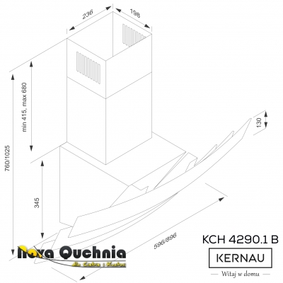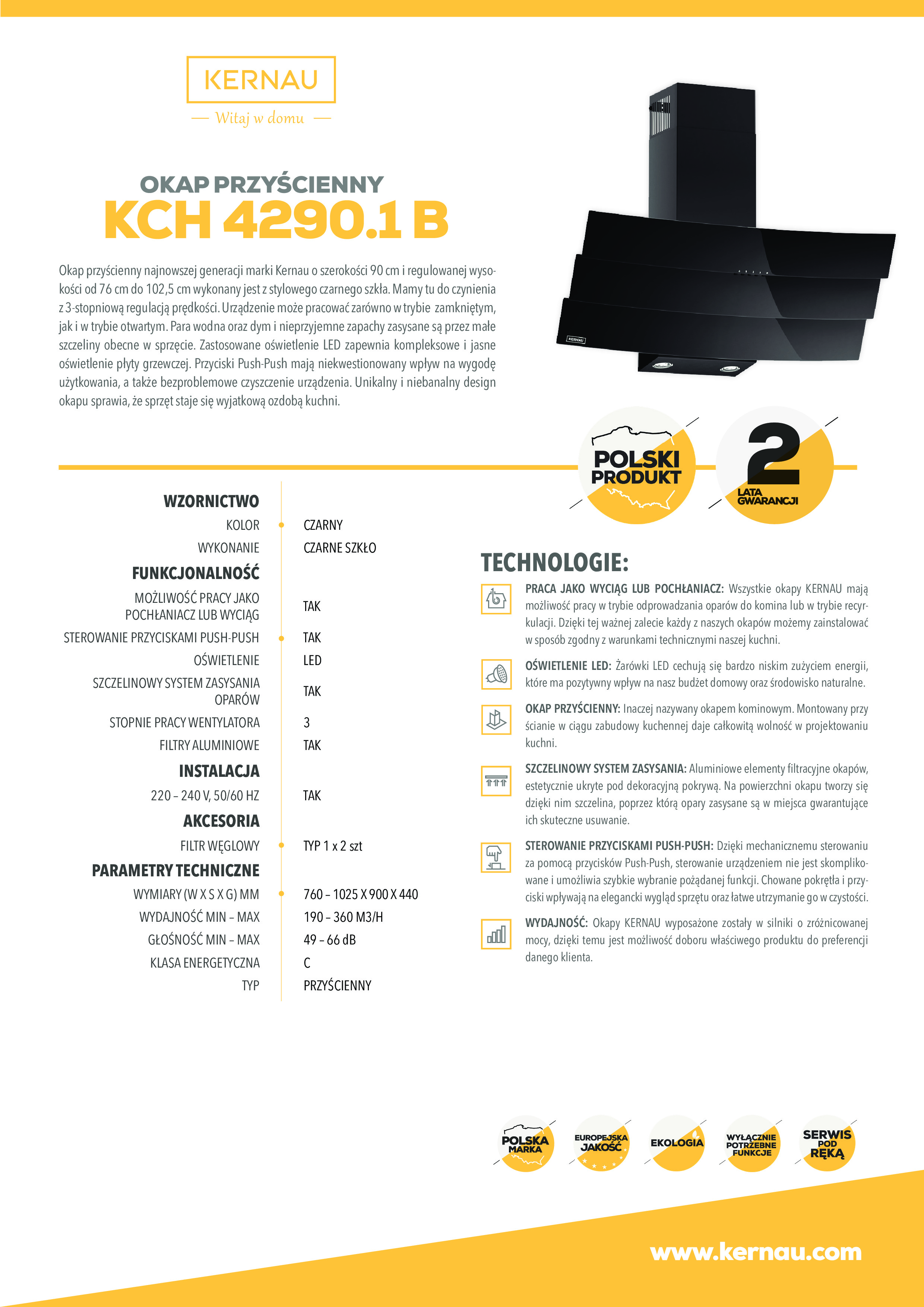 Okap kominowy, przyścienny o szerokości 90cm. Jeden silnik oraz 3 poziomy regulacji mocy. Sterowanie mechaniczne, przyciskami, typu Push-Push. Zasysanie oparów szczelinowe. Filtr aluminiowy, kasetonowy, przeciwtłuszczowy, przystosowany do mycia w zmywarce. Możliwość pracy jako pochłaniacz lub wyciąg. W pierwszym przypadku konieczność używania filtów węglowych. Wydajność maksymalna 360m3/h. Głośność maksymalna 66 dB[A]. Kolor czaszy Czarny. Wykończenie komina w kolorze Czarnym.