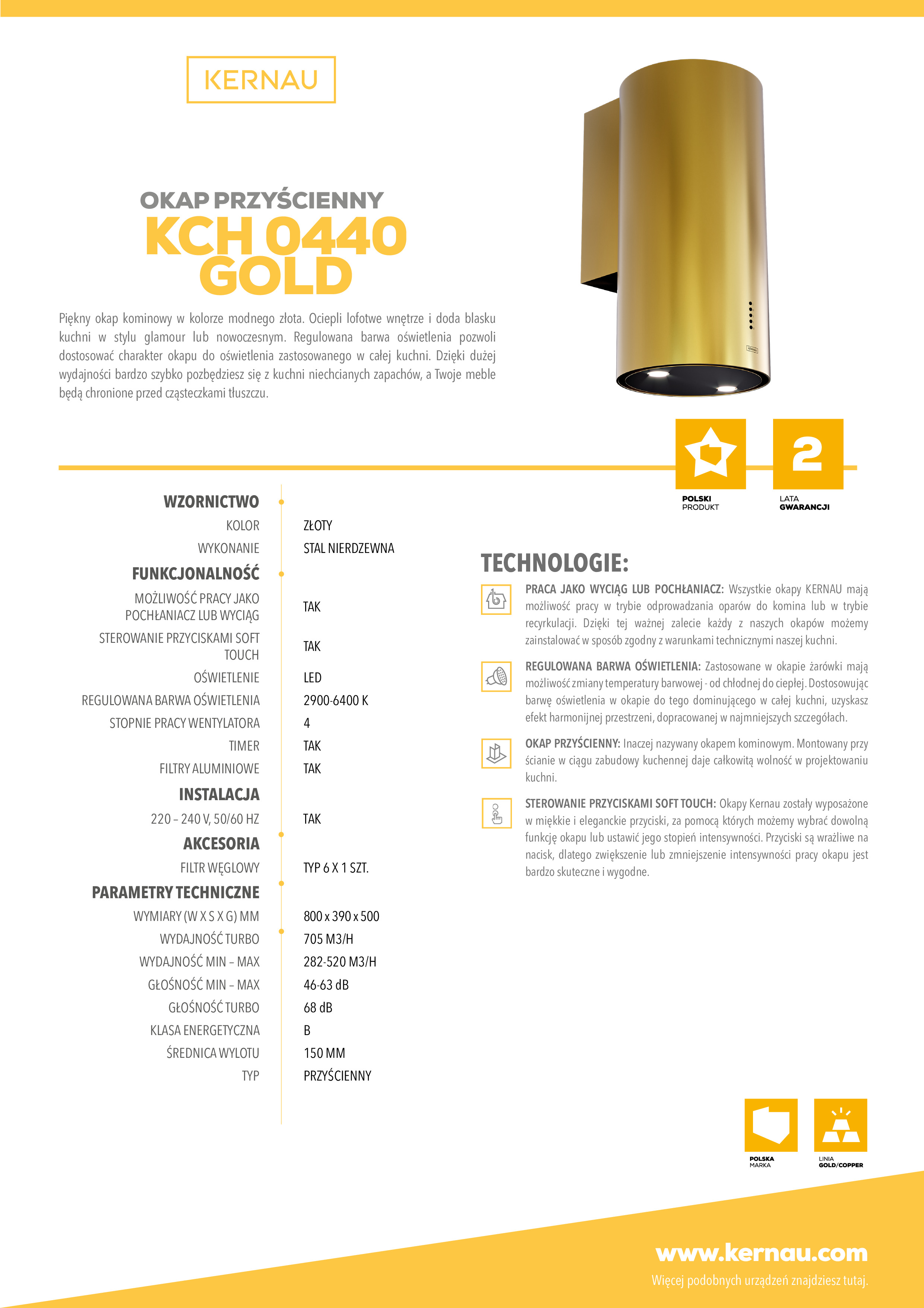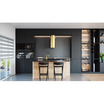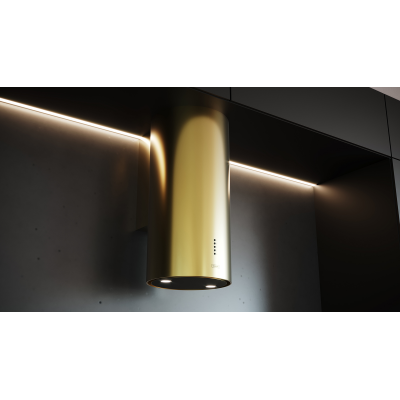 Okap przyścienny, kominowy o szerokości (średnicy) 39cm. 4 poziomy regulacji mocy w tym funkcja Turbo. Sterowanie elektroniczne, przyciski typu Soft Touch. Timer. Dwa punkty oświetleniowe LED, z możliwością zmiany barwy światła w zakresie 2900 - 6400K. Zasysanie oparów szczelinowe. Filtr aluminiowy, przeciwtłuszczowy, przystosowany do mycia w zmywarce, w kolorze czarnym. Maksymalna wydajność 705m3/h (Turbo). Głośność maksymalna 66 dB[A], (Turbo). Praca jako wyciąg lub pochłaniacz. Klasa energetyczna: B. Wykończenie w kolorze Gold (Złoty).