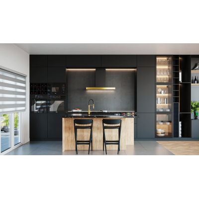 Okap kominowy, przyścienny, o szer. 90cm. Możliwa regulacja wysokości w zakresie 790-1010mm. Jeden silnik. Sterowanie gestami lub pilotem. 4 stopnie pracy wentylatora. Timer. Oświetlenie w postaci paska LED. Regulowana barwa oświetlenia w zakresie 2900-6400 K. Filtr aluminiowy, kasetonowy, przeciwtłuszczowy, przystosowany do mycia w zmywarce. Filtr jest w kolorze czarnym, w takim samym jak obudowa, przez to nie rzuca się w oczy. Wydajność maksymalna 690m3/h. Głośność maksymalna 70 dB[A]. Możliwość pracy jako pochłaniacz lub wyciąg. W pierwszym przypadku konieczność używania filtów węglowych. Klasa energetyczna: A+. Wykończenie w kolorze Czarnym (stal malowana na czarno) + Gold (złoty). Komin w kolorze Czarnym.