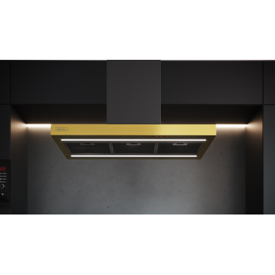 Okap kominowy, wyspowy, o szer. 89cm. Możliwa regulacja wysokości w zakresie 795-1155mm. Jeden silnik. Sterowanie przyciskami Soft Touch lub pilotem. 4 stopnie pracy wentylatora. Timer. Oświetlenie w postaci 2 pasków LED. Regulowana barwa oświetlenia w zakresie 2900-6400 K. Filtr aluminiowy, kasetonowy, przeciwtłuszczowy, przystosowany do mycia w zmywarce. Filtr jest w kolorze czarnym, w takim samym jak obudowa, przez to nie rzuca się w oczy. Wydajność maksymalna 695m3/h. Głośność maksymalna 70 dB[A]. Możliwość pracy jako pochłaniacz lub wyciąg. W pierwszym przypadku konieczność używania filtów węglowych. Klasa energetyczna: A. Wykończenie w kolorze Czarnym (stal malowana na czarno) + Gold (złoty). Komin w kolorze Czarnym.