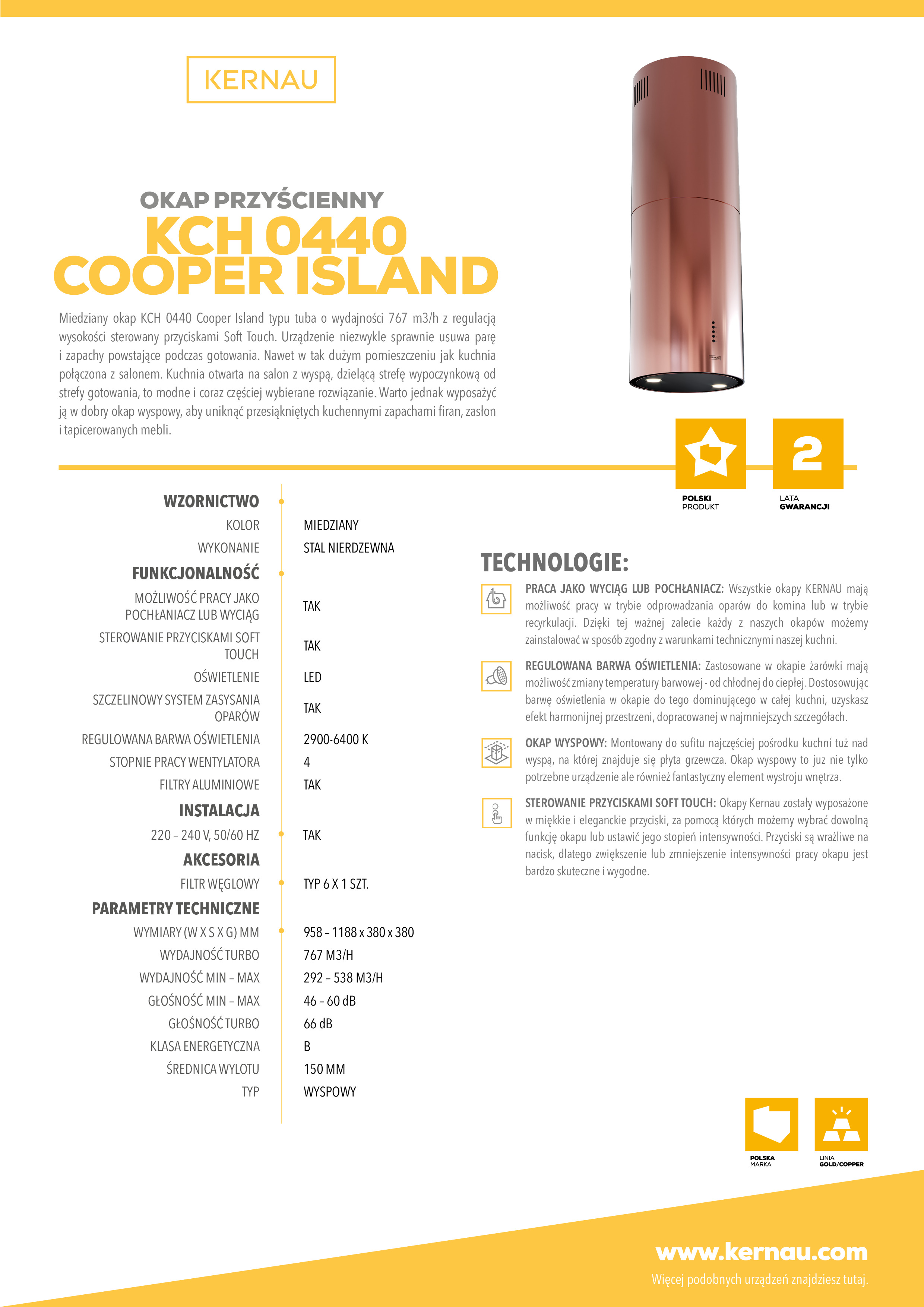 Okap wyspowy o szerokości 38cm. Możliwa regulacja wysokości w zakresie 765-1165mm. 4 poziomy regulacji mocy w tym funkcja Turbo. Sterowanie elektroniczne, przyciski typu Soft Touch. Timer. Wyświetlacz. Dwa punkty oświetleniowe LED. Regulowana barwa oświetlenia w zakresie 2900-6400'K. Zasysanie oparów szczelinowe. Filtr aluminiowy, kasetonowy, przeciwtłuszczowy, w kolorze czarnym, przystosowany do mycia w zmywarce. Maksymalna wydajność 767m3/h. Głośność maksymalna 66 dB[A]. Regulowana wysokość w zakresie 865-1165mm. Klasa energetyczna: B. Wykończenie w kolorze Copper (Miedziany). Linia estetyczna: Nowoczesna.