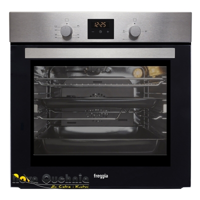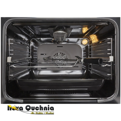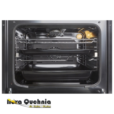 Piekarnik GAZOWY 4-funkcyjny z grillem. Grill GAZOWY. ROŻEN. Szerokość 60cm. Pojemność piekarnika 54l. Konwekcja, czyli wymuszony obieg powietrza wewnątrz piekarnika podczas pieczenia. Płaski front. Sterowanie mechaniczne z elektronicznym zegarem. Automatyczna zpalarka elektryczna. Przeciwwypływowe zabezpiecznie gazu. Wnętrze piekarnika pokryte emalią łatwą do czyszczenia. Stalowe drabinki boczne. Jednopoziomowe prowadnice teleskopowe. Oświetlenie wnętrza piekarnika LED. Tylny i boczne samoczyszczące się panele katalityczne. Podwójna szyba drzwiczek z szybą termo-refleksyjną. Zdejmowane drzwi oraz wyjmowana wewnętrzna szyba. Max. temperatura pieczenia: 270'C. Chłodzenie obudowy. Blokada rodzicielska. Wymienne dysze na gaz propan-butan. Na wyposażeniu dwie blachy do pieczenia oraz ruszt. Wykończenie w kolorze Inox. Linia estetyczna: Moderno.