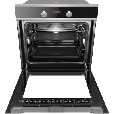 Piekarnik elektryczny, 11-funkcyjny z termoobiegiem 3D. Programator elektroniczny z zegarem cyfrowym, sterowany za pomocą pokręteł typu PUSH-PUSH czyli chowanych w obudowie. TIMER elektroniczny. Wyświetlacz LED. Potrójna szyba w drzwiach z powłoką THERMO-REFLECTIVE. Prowadnice teleskopowe na jednym poziomie. Wnętrze piekarnika pokryte łatwą do czyszczenia emalią PERFECT CLEAN ENAMEL. Oświetlenie wnętrza piekarnika. Grill. Chłodzenie obudowy piekarnika. Drzwi panoramiczne. Blokada rodzicielska. Na wyposażeniu piekarnika: emaliowana blacha do pieczenia 1szt, głęboka emaliowana blacha do pieczenia 1szt i ruszt chromowany 1szt. Zakres temperatur: 50'-250'C. Pojemność piekarnika 77l. Klasa energetyczna A. Wykończenie Czarne Szkło + Inox.